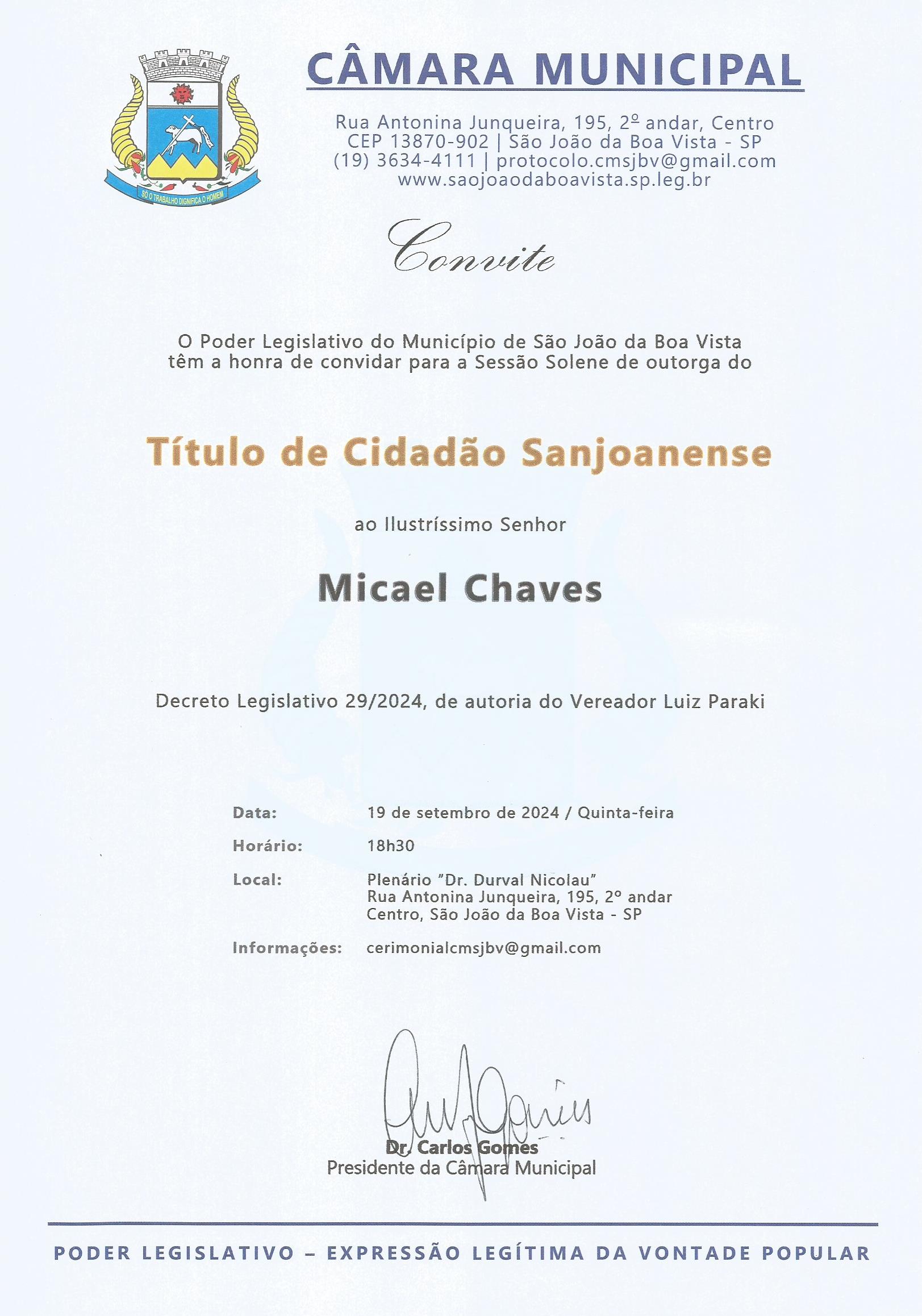 Próximo: Sessão Solene - Título de Cidadão Sanjoanense - Micael Chaves »