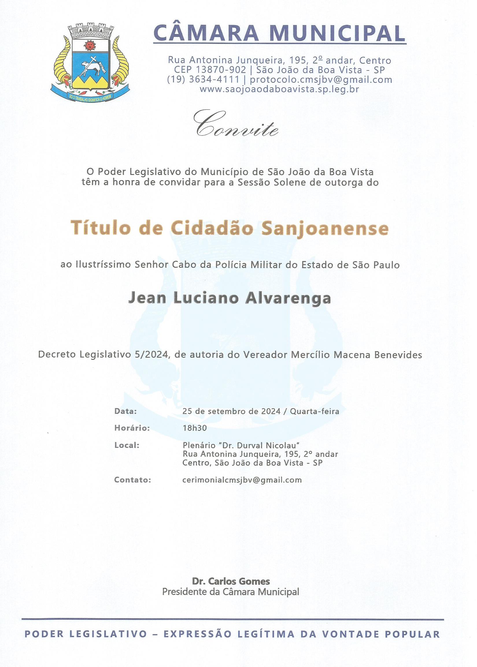 Próximo: Sessão Solene - Título de Cidadão Sanjoanense - Jean Luciano Alvarenga »