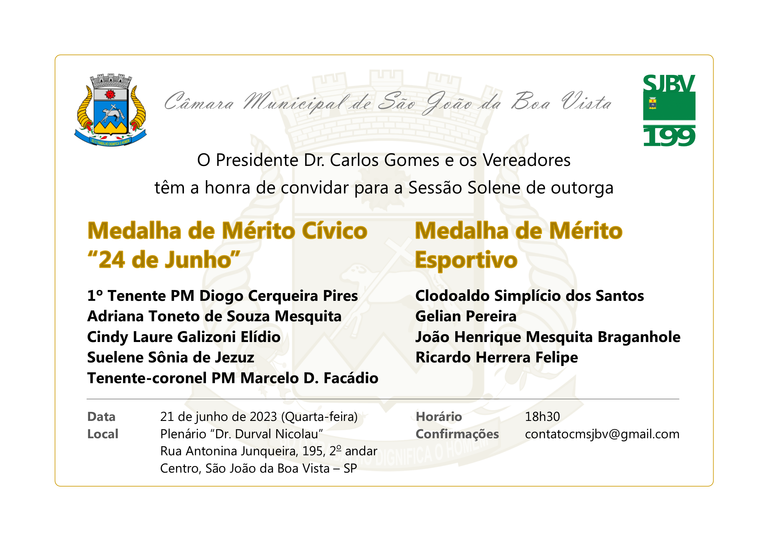 O Presidente da Câmara Municipal de São João da Boa Vista, Dr. Carlos Gomes, e os Vereadores têm a honra de convidar para a Sessão Solene de outorga: